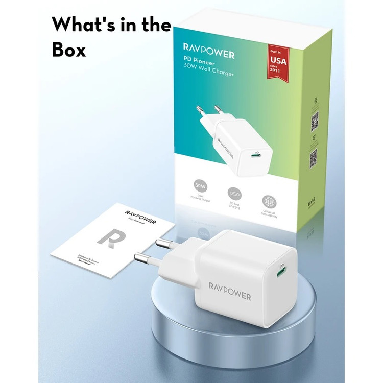 شارژر دیواری راوپاور مدل RavPower RP-Pc169 توان خروجی آن 30 وات می باشد. دارای یک خروج تایپ سی می باشد که این خروجی دارای فناوری PD است که می تواند بالاترین توان ممکن خود را دریافت کند و با تنظیم آن جریان را به موبایل شما انتقال بدهد. دو شاخه آن ایرانی می باشد که نیاز به تبدیل ندارد و سازگار با پریز برق های ایرانی است.