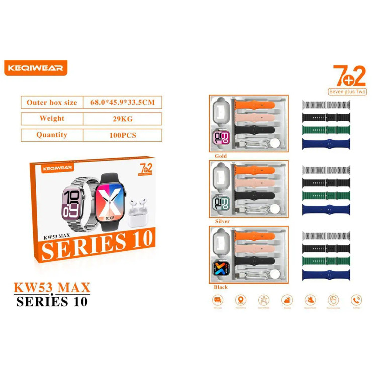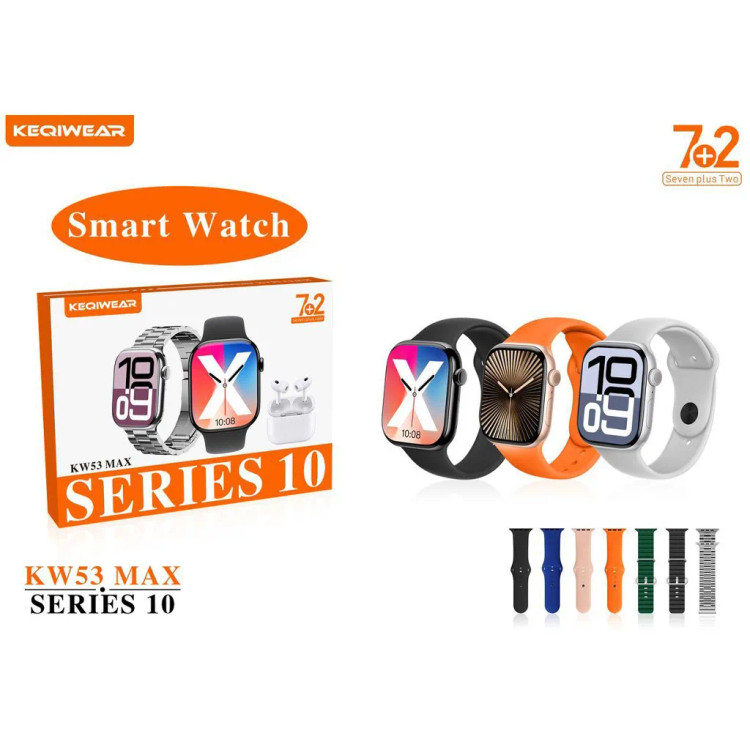 اسمارت واچ KW53 MAX در قالب یک پکیج بسیار شیک عرضه می شود که شامل خود ساعت، هفت بند متنوع با رنگ بندی جذاب، یک ایرپاد شبیه ایرپاد پرو اپل و شارژر وایرلسی است. یکی از این هفت بند، بند رولکسی فلزی است که وقتی در کنار ساعت قرار می گیرد، ظاهری فوق العاده شیک و لوکس ایجاد می کند.