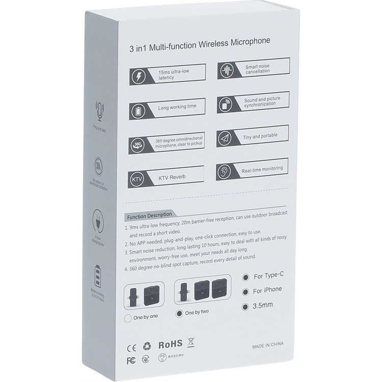 ۲ عدد فرستنده, |, ۱ عدد گیرنده, |, ۱ عدد کابل Type-C برای شارژ, |, 1 عدد تبدیل جک 3.5 میلی متری TRRS (3خط) به جک 3.5 میلی متری TRS (2خط)