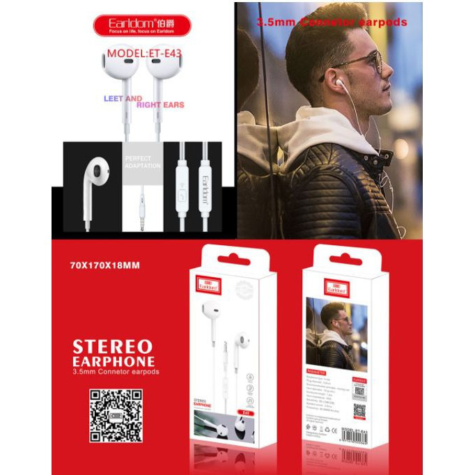 هندزفری Earldom مدل ET-E43 از نوع هدفون های طرح اپل با طراحی زیبا و ساده با کابل کیفیت مناسب مصارف روزانه و پیاده روی میباشد.این هدفون زیبا با قابلیت اتصال به انواع دیوایس های گوشیهای هوشمند، تبلت، موزیک پلیر ها و هر دستگاهی که فیش AUX 3.5 میلیمتری را پشتیبانی کند قابل اتصال است. ظاهر ساده اما ظریف هندزفری Earldom مدل ET-E43 با حجم خروجی صدای بالا با فرکانس 20Hz تا 20KHz و بدون نویز نظر شنوندگان را در انتخاب خود جلب میکند. این هدست سیمی دارای یک میکروفون مخفی HD جهت برقراری مکالمات صوتی و تصویری و مدیریت آن بکار میرود. سرگوش های مدل ET-E43 با ساختار ارگونومی و منطبق با ساختار گوش برای گوش های راست و چپ طراحی شده و برای شنیدن کیفیت صدای بهتر و آسیب کمتر از آن می توان در تمامی شرایط و برای طولانی مدت از آن براحتی استفاده کرد. پشتیبانی از فناوری Stereo ،سیستم نویز گیر قوی میتواند بالاترین میزان نرمی و شفافی صدا را با کمترین نویز به شما ارائه دهد. همچنین از مشخصات و پارامتر های این مدل امپادانس 16 اهم ،حساسیت 92 دسی بلی و توان کلی 3-5میلی وات میباشد. کابل مورد استفاده در این ایرفون با خروجی Aux بصورت گرد و جنسیت عالی PU بسیار انعطافپذیر و مقاوم بالایی در برابر کشیدگی داشته و با طول در حدود 120 سانتی متر و یک پنل کنترل صدا برای پاسخ و یا رد تماس دارد. این هدفون سیمی مناسب برای گوش کردن به موسیقی مورد علاقه خود از موبایل و پخش کنندههای از قبیل انواع Mp3 پلیر و MP4 پلیر و لبتاپ و کامپیوتر هایی که دارای درگاه جک 3.5 میلیمتری بسیار عالی میباشند.